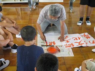 授業の最初に、ボランティアの先生がお手本を書いてくださった時、子供たちは素晴らしい文字に感動して拍手していました。その後、一人一人にアドバイスをしていただき、みんな満足した文字が書けたようです。夏休みに入ってからのサマースクールで、さらに練習して清書します。