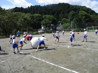 5日(火)は、朝から晴天でした。3校時の全体練習は、ラジオ体操・綱引き・台風の目の全体練習でした。一年生はどの種目も初めてですが、6年生にサポートしてもらいながら頑張っていました。途中で休憩して、水分補給をしました。終わった後は、5・6年生が片付けをしています。