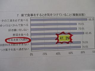 本校は全員「朝ご飯は食べていますか」という質問に全員挙手をしました。朝ごはんは、①脳の目覚ましスイッチをオンにし、②体の目覚ましスイッチをオンにし、③ウンチが出るスイッチをオンにしてくれます。また、それぞれ、どんな食品を食べたらよいかもイラストで説明してくださいました。本校のアンケートの結果、主食は食べているので、主菜や副菜をもっと食べるとよいというアドバイスをいただきました。さらにプラスするとよい「牛乳」は、41%の児童しか飲んでいないという結果が伝えられ、給食以外にも家庭でも飲むと体によいことを教えていただきました。子供たちは真剣に聞いていて、話の後に質問している児童もいました。