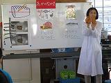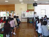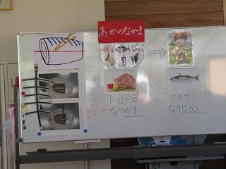今日のテーマは、「魚」でした。栄養素の「赤」の仲間の「肉」と「魚」では、子供たちは肉が好きと答えていました。しかし、肉と魚を1対1の割合くらいに食べるとよいことを教わりました。肉ばかり食べ過ぎると、血液がドロドロになり、病気にもかかりやすくなるという話がありました。血管の模型を見せていただき、ドロドロの様子に驚いていました。今日の話をもとに、きっと肉と魚とバランスよく食べるように心掛けると思います。