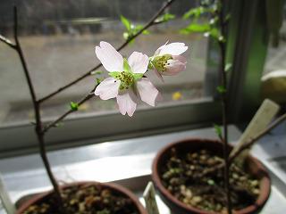 オカメザクラとは、淡い紅色の一重咲き。花が下を向いているのが特徴です。早咲きで花期は2月下旬から3月上旬ごろです。昨年挿し芽したオカメザクラの花が今日、咲きました。年末に職員室に入れておいた鉢の花が、1か月も早く咲きました。一足先に春を味わいました。