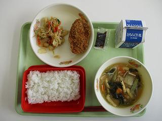 今日の給食は、さつきランチ(特産物献立)でした。「ごはん・牛乳・モロいそべフライ・ごまあえ・かんぴょうのみそ汁」が献立でした。