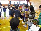 5年生が進行と児童代表あいさつをして会は始まりました。ゲームは、ドッジビーと「なんでもバスケット」でした。「何でもバスケット」には先生たちも入りました。くす玉は6年生が玉入れの玉を投げたら、割合簡単に割れました。6年生へは、色紙(下級生全員からのメッセージカード)と6年生に贈る詩の入った手紙とパンジーの鉢植えがプレゼントされました。そして、6年生からも一人一人の写真入りのカレンダーとお手紙がラミネートされたカードが一人一人にプレゼントされました。世界に一つしかないカレンダーです。1年生は喜んで大切そうに持っていました。また、ランチルームで使う、手縫いのぞうきんも代表から代表へプレゼントされました。人数が少ないからこそできる、心のこもったプレゼントでした。その後、6年間の思い出のスライドショー、歌「いっぱいありがとう」、全校生で記念写真撮影をしました。今日記念写真を色紙の真ん中に貼りました。