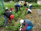 4時間目に5・6年生が、じゃがいもの芽かきをしていました。大きめの芽を残して、他の芽は根元から、かきとっていました。