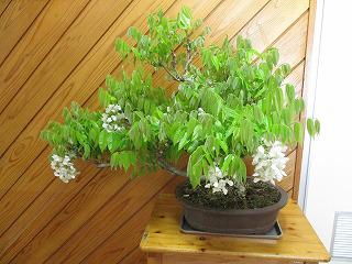 職員玄関を入ると、すぐに目に入る場所に、お習字ボランティアの先生が持ってきてくださった藤の盆栽が飾ってあります。白い花が美しく咲いています。
