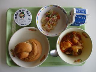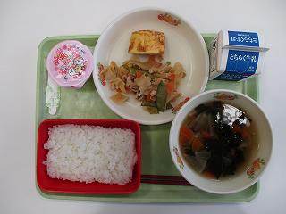 20日(金)の給食は「さつきランチ」でした。さつきランチとは、鹿沼市や栃木県のおいしい食べ物を使った給食のことです。インド煮の中に、こんにゃくが入っていますが、鹿沼市はこんにゃくの生産が有名な市です。主に、粟野・西大芦・加蘇地区で多く作られていますが、上南摩町でも栽培している農家があります。献立は、「牛乳・さつきのまい米粉パン・インド煮・かんぴょうサラダ・県産ヨーグルト」でした。今日もおいしくいただきました。給食の後は授業参観です。