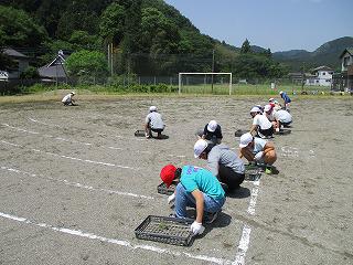 今日の業間のクリーンタイムは除草でした。体力テストの時のラインに沿って分担を決めて除草をしました。暑かったので、短時間で行い、残りの時間は、ブランコに乗ったり、バドミントンをしたりして遊びました。今度の日曜日はクリーンデーです。保護者・地域の方にも草刈りや除草をしていただきますが、その前に自分たちも頑張りました。