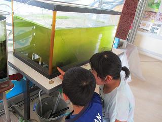 昇降口に水槽が2つあります。水槽には、子供たちがつかまえてきた「ナマズ」と「どしょう」がいます。ときどき、子供たちが水槽を覗いて、えさをあげたり、掃除をしたりしています。