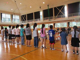 最初に、子供たちが校歌と「Dream&Dream」の2曲を歌いました。その後、名刺交換ゲームをして交流し、トリオ等の演奏を聴きました。演奏の後、チェロやヴァイオリン、サキソフォン、ピアノの楽器に触れる体験をさせていただきました。合唱団の歌声に感動した後に、一緒にゲームを楽しみました。