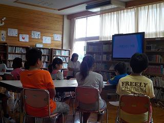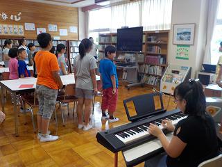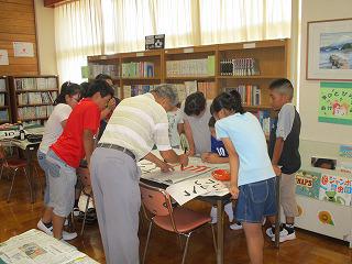 今日は、サマースクール1日目でした。3~6年生は習字の清書でした。1~2年生は、「夏休みの友」などの学習の時間でした。エアコンのある図書室とパソコン室に分かれて実施しました。習字の方は、いつもご指導いただいているボランティアの先生が一人一人に指導してくださいました。みんな元気に夏休みを過ごしているようです。
