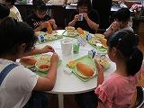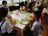 今日の給食も校長室兼会議室がランチルームに変身しました。いつもは机が一列に並んで会議ができるようにしていますが、テーブルを3箇所に分けると20人座れました。エアコンで涼しい中で、楽しそうに食べていました。今日は、7・8月に誕生日を迎える3人に「おめでとう」の拍手をしました。