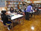 毎週金曜日の朝の学習は、これからの1週間の自主学習の計画を立てます。いつもは、各学級で行っていますが、今日は全校生が図書室に集まって、先生の話を聞いたり、上級生のノートを見せてもらったりしていました。内容の充実を図るのが目的です。担任以外の先生達も、子供たちがどんな自主学習をしているかを知り、アドバイスしていました。