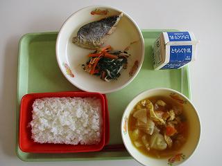 「ごはん・牛乳・白身魚のゆうあん焼き・和風和え・かぼちゃ入りすいとん風」
