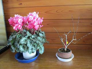 「黄梅」と「ロウバイ」の黄色い花が咲き始めました。「ロウバイ」は南摩フェスティバルで買ってきました。シクラメンは、11月に近くの直売所で買ったものですが、次々と花を咲かせています。昨年の入学式の受付に置いたガーベラが秋にも咲いたのですが、また咲こうと頑張っています。