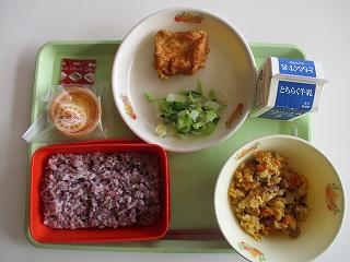 「牛乳・ごはん・いわしのごまみそに・なのはなあえ・だいこんのみそしる・ふくまめ」