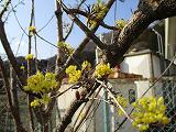 学校の入口の右側に、サンシュユの黄色い花が可憐に咲いています。その近くには、二宮金次郎の石像があります。さらに右側の体育館通路を横切ると、「みどりん広場」というビオトープがあります。そこにもサンシュユの黄色い花が咲いています。