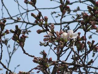 先ほど、一年間のお礼の言葉を書かせていただきましたが、校長室横の桜を見ると、白っぽい花びらが見えたので、外へ出て観察しました。すると、5輪咲いていましたので、職員室に戻り、開花宣言をしました。別の桜にも5輪咲いていました。始業式・入学式の頃に満開になってほしいと思います。