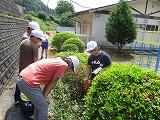 毎朝、登校してくると全員が農園や花壇の野菜や花の水やりをしています。ピーマンやなす、ズッキーニの実が育っています。サツマイモも一時枯れそうな感じになりましたが、みんなが水をやり続けて、今は元気に育っています。植物の世話は、本校の伝統です。今年も引き継いでいます。