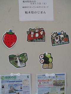 6月15日は県民の日です。先週の全校集会でも話をしましたが、郵便局のポストカードを掲示しました。栃木県の特色を表している「眠り猫」「いちご」「かんぴょう」などのかわいいデザインです。子供たちに栃木県について関心をもってもらえればと思います。