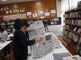 3~6年生の水曜日の朝学は、新聞タイムです。図書室に来て、ワークシートと新聞を取って席について始まります。今日は、先生から新聞記事の紹介がありました。その後は、記事を選んで切り取り、記事の内容紹介と感想を書きました。先週の土曜日に、教員向けの「NIEセミナー」があり、先生方が参加して勉強してきました。その内容も今後取り入れていきます。