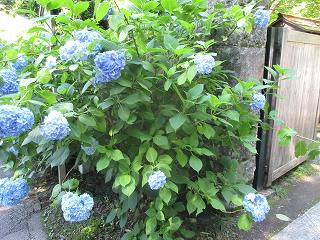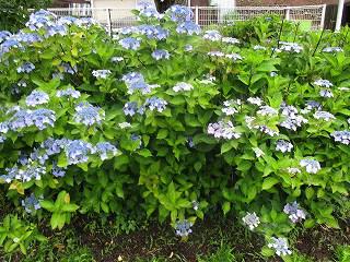 校門そばの紫陽花が雨の中で美しく咲いています。
