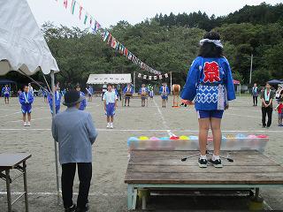 本校オリジナルの「上南摩小音頭」を今年は、プログラムの最後に踊りました。代表の児童が朝礼台の上で説明して、唄・太鼓を6年生4名が担当しました。保護者の方々も毎年踊っているので、一緒に踊りました。たすきを持って踊り、みんなで大きな輪ができます。今年は、作詞者の方が会場に来てくださったので、皆様に紹介させていただきました。