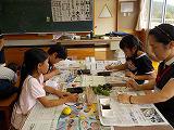 また、講師の先生が、「多羅葉(タラヨウ)」の葉を持ってきてくださり、「葉書」という名前の由来を教えてくださいました。葉に先がとがった串で文字を書きました。子供たちは、家族への感謝の言葉などを書いていました。講師の先生には大変お世話になり、毎年素敵な作品が完成しています。ありがとうございました。