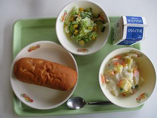 今日の給食は、アップルパンでした。一口メモによると、「りんごには、食物繊維やビタミンC、ミネラルが含まれているので、おなかの調子を整えたり、風邪を予防してくれたりする」そうです。今日は風邪をひいている子が多いので、アップルパンをしっかり食べました。ちょっと肌寒いので、温かなさつまいもの入ったシチューが美味しかったです。