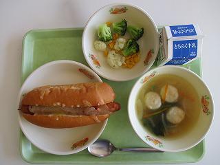 献立(牛乳・チーズホットドック・はなやさいサラダ・えびだんごスープ)