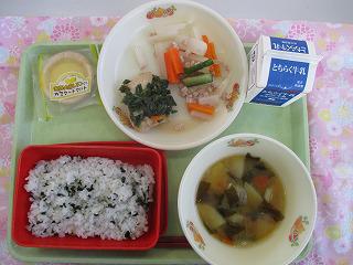 献立「牛乳・ごはん・親子煮・のり和え・かき」