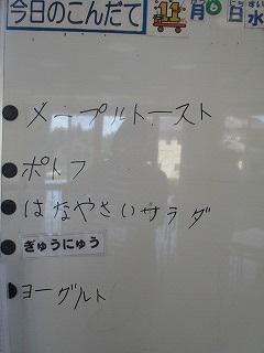 今日の給食は、メープルトーストでした。調理員さんたちが一枚一枚、メープル液をつけて焼いてくださったトーストです。美味しくいただきました。