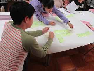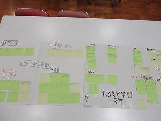 放課後、研究協議を行いました。本時の理科の授業での新聞の活用の仕方は効果的だったかを話し合ったり、5年の国語での実践事例を紹介したりしました。その後、新聞を活用する授業のアイディアを付箋紙に書いて教科ごとに分類し、今までに実践した事例にはシールを貼りました。これから、もっと事例を書いた付箋紙をどんどん増やしていきます。最後に市教委の指導主事の先生にご指導をいただきました。