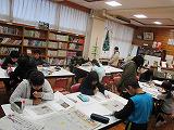 3年生から6年生が、ボランティアの先生にご指導いただき、書き初めの練習をしました。基本の練習をしてから、お手本をよく見て、いつもより大きな半紙に書きました。机の上では書きにくいので、床に長い下敷きを敷いて書きました。いつもより太い筆を使って、太く大きく、立派な文字が書けました。