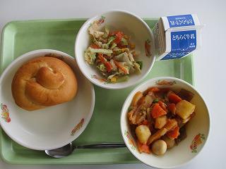 今日の給食は、さつきランチでした。栃木県産や鹿沼産の食材が出ます。今日は、かんぴょうでした。献立は、牛乳・インド煮・米粉パン・かんぴょうサラダでした。