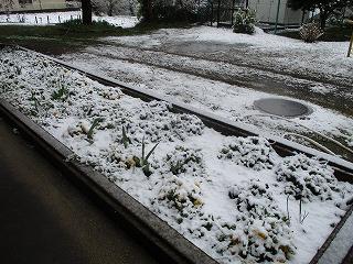 昨日は、花壇のパンジーや桜の花びらの上に雪が積もりました。