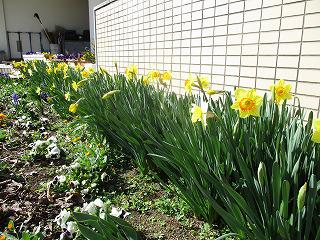 かだんのスイセンはきれいにさいています。チューリップもどんどんのびています。