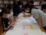 子供たちはそれぞれに付箋紙を使って書き出し、テーブルの用紙はあっという間に埋め尽くされました。