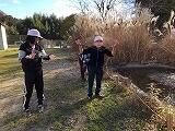 業間になると校庭に駆け出し、「もりりん」の宣言池に張った氷で遊んでいます。