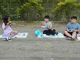 1・2年生たちは校庭の桜の木の下で、3~6年生たちは屋上から校庭の緑がよく見える場所を選びました。
