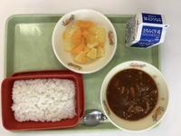 今日の献立は、ハヤシライスとフルーツカクテルです。ハヤシライスは児童にも特に人気でした。片付け時、何人も「美味しかったです!」と言っていて、完食者が続出していました。