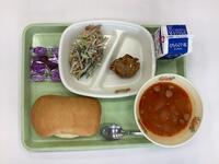 今日の給食は、ポークビーンズ、いちごジャムつき食パン、ハムチーズサラダです。ポークビーンズは、たくさん入っている豆にトマト味が染み込んでいて、とても美味しかったです。