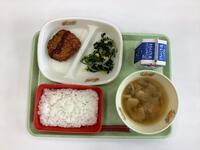今日の給食は、チキンみそカツ、ご飯、おひたし、いなか汁です。チキンカツと白米の最高な相性を味わいながら、間におひたしでさっぱりと野菜が摂れます。いなか汁に厚揚げが入っていて、美味しさを引き立てていました。