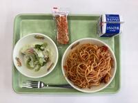 今日の給食は、スパゲティツナトマトソース、ハムマリネサラダ、チーズドックです。スパゲティは、ツナがポイントのトマト味です。ベーコンやボロニアソーセージも入っていて、うま味が食欲をそそりました。デザートのチーズドックが嬉しい一品です。