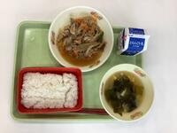 今日の給食は、セルフ肉丼、ご飯、豆腐とわかめのみそ汁です。肉丼の具は、薄味ながら素材の味とだしがマッチして、とても自然な味付けでした。児童は、つゆだくの具をご飯にかける子、別々に食べる子と、お好みの食べ方で味わったようです。