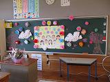 体育館の真ん中付近に、在校生の習字と図工の作品が掲示してあります。6年生が書いた条幅は前日に展示します。また、体育館の入口には、卒業式のために、在校生が書いたメッセージが鳩の形をしたカードに書かれて貼られています。また、卒業生が1年生の時から6年生までの懐かしい集合写真が6枚掲示されています。