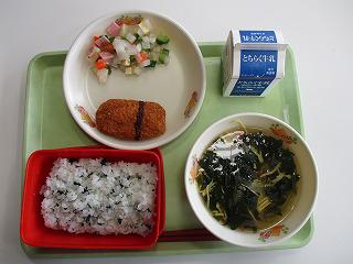 「わかめごはん・牛乳・チーズささみフライ・カリコリサラダ・すましじる」