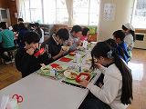 今日は、「卒業おめでとうこんだて」でした。本校の給食は南摩小の給食室で南摩中と本校の分を作っています。中学生は10日が卒業式です。中学校を卒業すると、もう給食は食べられないので、みんなの大好きな物を集めた献立だそうです。