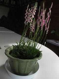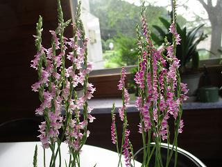 ボランティアの方が「ネジバナ」の植木鉢を持って来てくださいました。「ネジバナ」はラン科ですが、身近な野花です。特に日当たりのよい芝地を好むそうです。花の穂はねじれるようにつき、そのねじれ方は一本一本異なるそうです。右巻きと左巻きの割合は半々で、中にはほとんど巻かないものもあるそうです。株によって、色の濃さが異なり、ぐるぐるねじれていてかわいい花です。昇降口に置いてあります。