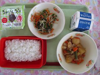 今週は「ふれあい給食」です。紅白チームで食べることで、運動会に向けての団結力を高める目的です。(9月2日の給食です。)