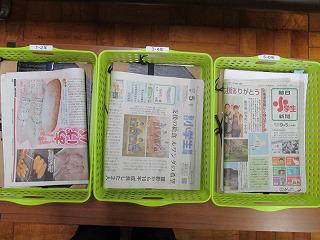 本校では、NIEの実践に取り組んでいます。子供たちだけでなく、先生たちも新聞を読んで、教材として使えそうな記事を切り抜き、分類して保存しています。保存されている記事は、誰でも教材として使えるように整理しています。ちょうど保健関係の棚にあった「鼻血が出たら」という記事は保健室前に掲示されました。気がついた人が、どんどん切り抜いて保存し、授業で活用していきます。